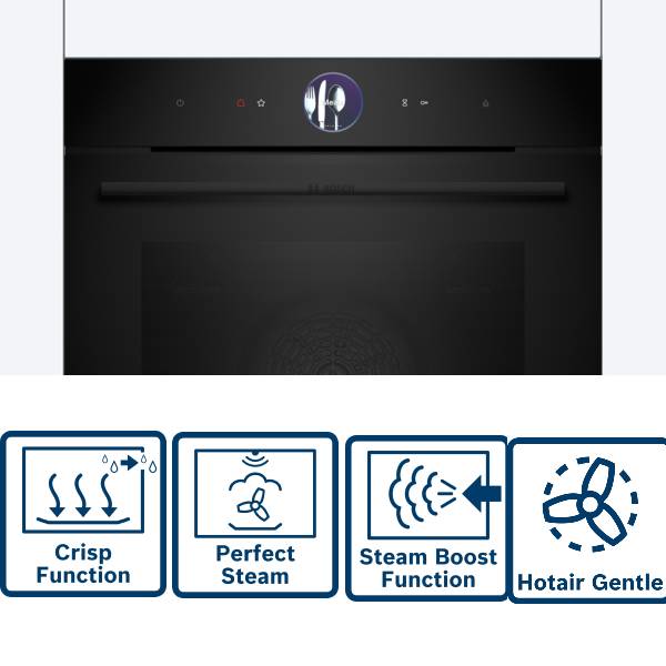 Vgradna pečica s funkcijo dodajanja pare, z digitalnim upravljalnim obročem in TFT zaslonom na dotik. Funkcija pomoči pri obrokih: samodejno pripravi vaše jedi, tako da so hrustljave in sočne, PerfectRoast Plus, PerfectBake Plus, Home Connect za nadzor prek aplikacije.