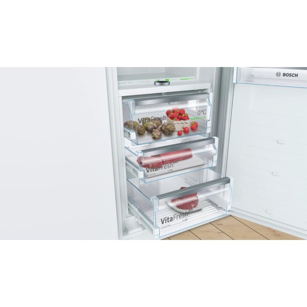 Vgradni hladilnik z VitaFresh pro predalom. Zahvaljujoč funkciji 0° in optimalnem nivoju vlažnosti vaša hrana ohrani vitamine in svežino do trikrat dlje.