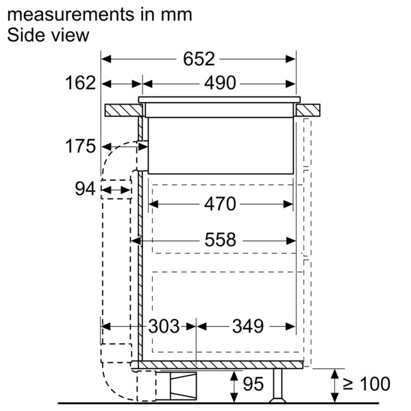| – Pod kuhalno ploščo z vgrajenim dvižnim prezračevalnim sistemom ni treba namestiti vmesnega dna. Predali in/ali police v talni enoti morajo biti snemljivi. Zadnjo ploščo talne enote se lahko ohrani – potreben je le izrez za izpust zraka (položaj in velikost sta navedena v navodilih za namestitev). |