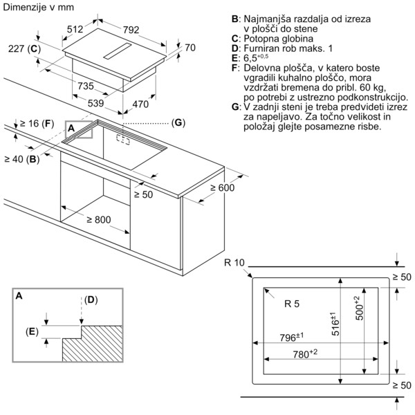 | Zahtevana velikost niše za vgradnjo (VxŠxD mm): 227 x 796 x 516 |